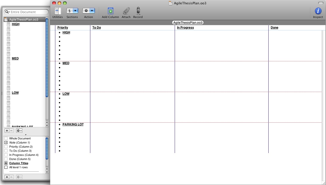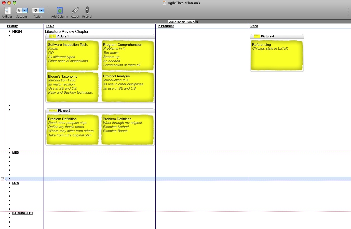 Over this weekend I have spent much time attempting to work out how to reach my goal for this month: draft 1 of my thesis completed by May 26. I was recently at ASWEC 2009 with a theme of Agile the New Mainstream. After much thought in the last few days I’ve decided to attempt writing my thesis in an Agile manner. Currently, I’m not sure how this will all look but I am working on it. My template planner looks like this: